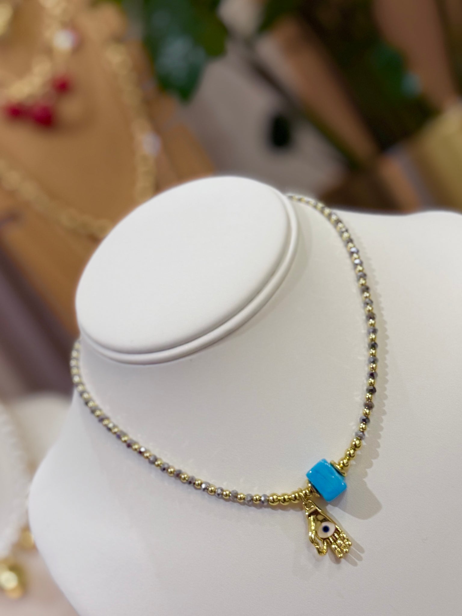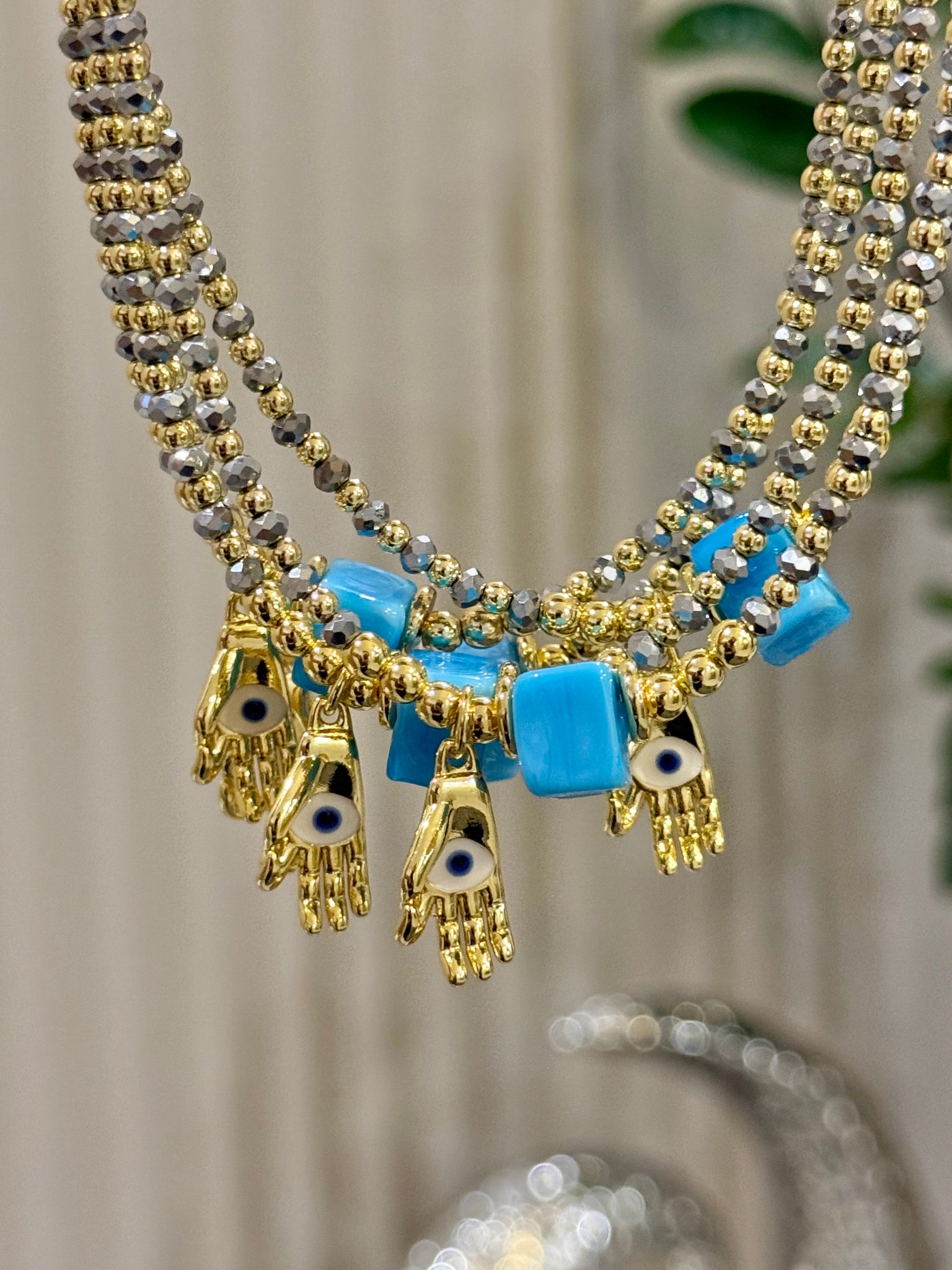 The Choker Hamsa Glow is a talisman of protection and light, created to safeguard your energy and elevate your vibration. The Hamsa hand — an ancestral symbol against the evil eye and negative energies — acts as a spiritual shield, while the blue cube represents calm, protection, and mental clarity, helping you maintain emotional balance.